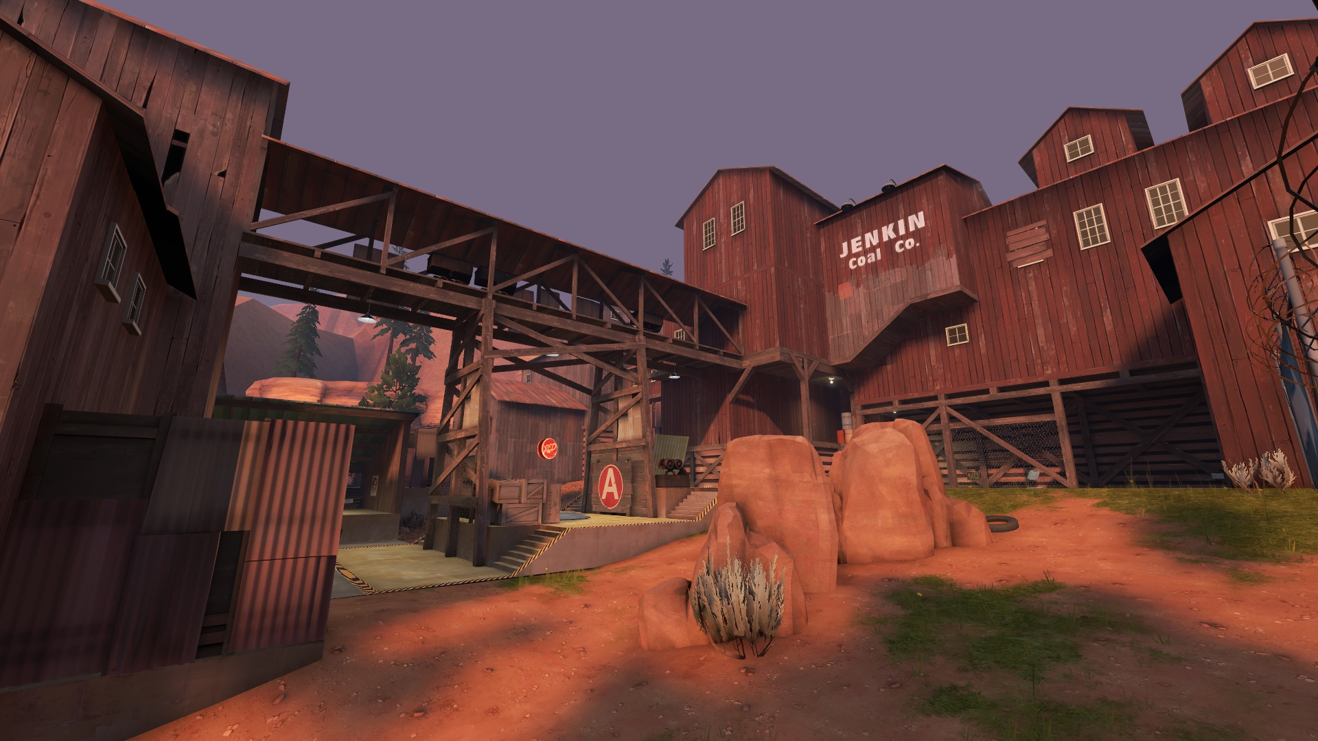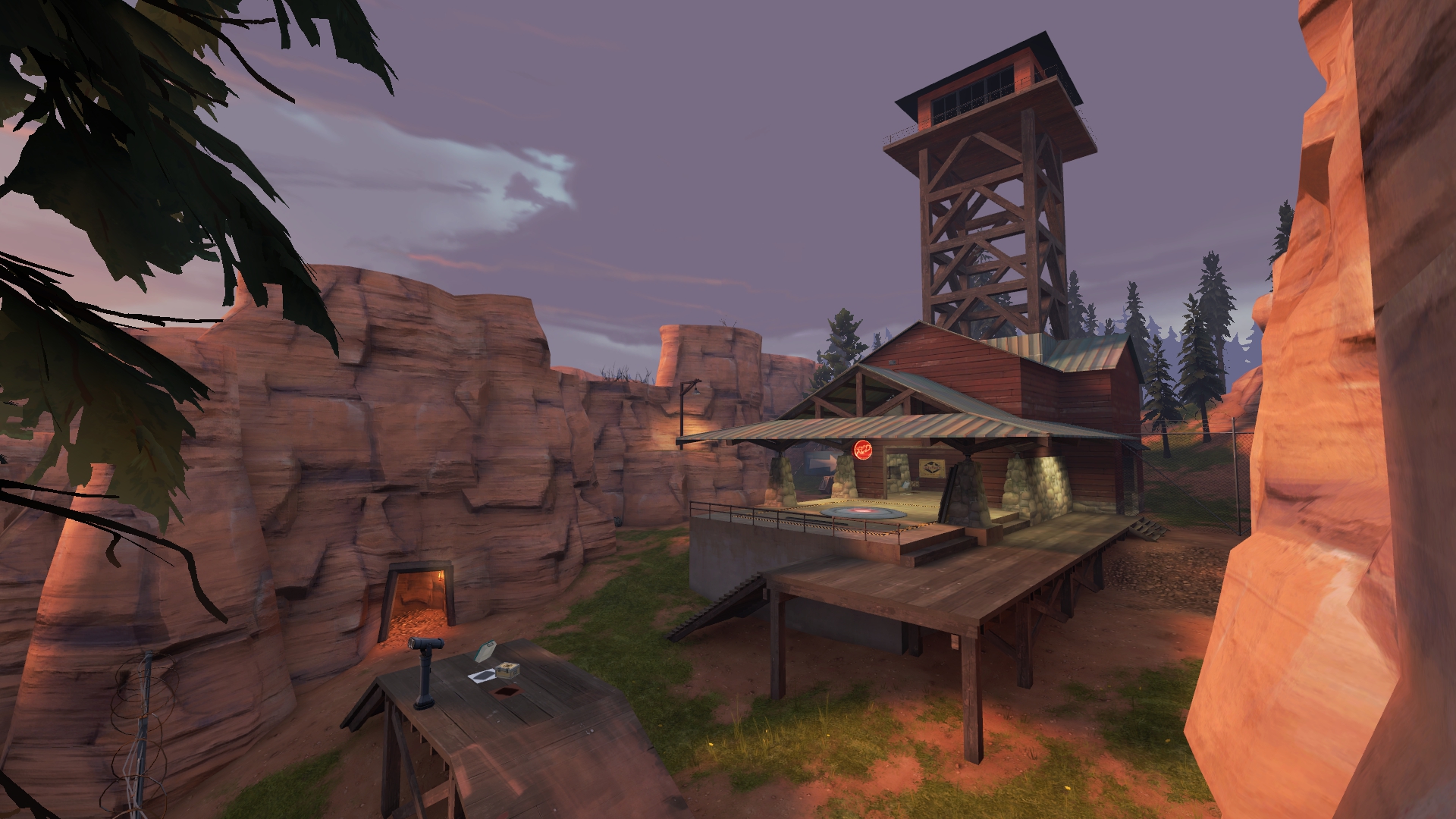 The map is divided into two stages: The first stage is based on Dixie National Forest, leading through red cliffs and green trees, ending in a visitor's center inspired by mid-century modern architecture. The second stage leads through a supposedly abandoned industrial area, including mining and wood milling operations, and ending in a hydroelectric facility. This variety of locations provides a variety of gameplay situations, such as a capture zone with walls inside that allow defense to block a capture in creative ways, or a moving sawblade that kills players while also providing strong cover to anyone on the point.
