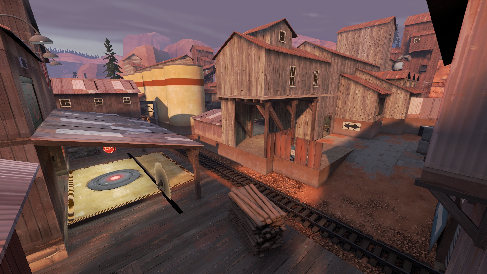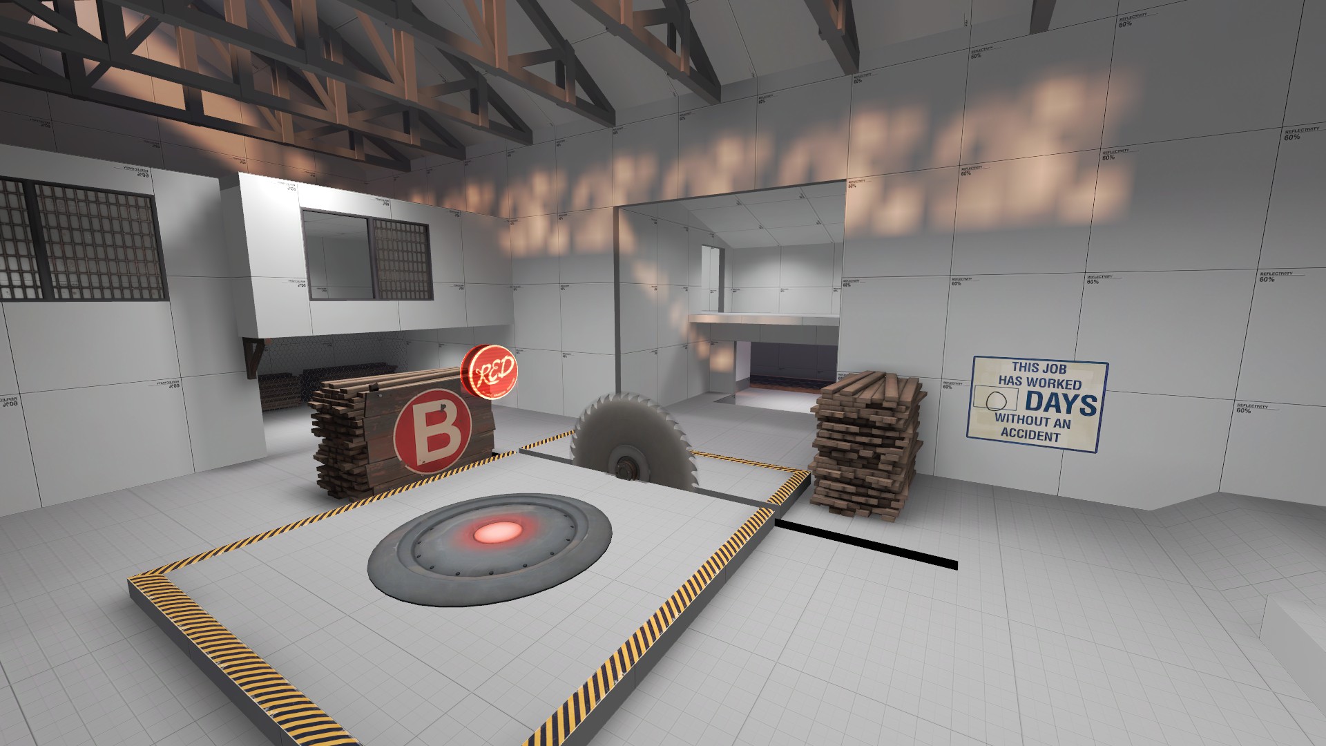 The second point of the second stage was always designed around a moving sawblade, but it took a few versions to arrive on the final idea. Initial drafts had the teams approach the point from two angles at a 90 degree angle, which meant the sawblade had trouble performing its job as a sightline blocker in a consequential manner. The final version has both teams approaching the point from the same side, allowing both teams to use the sawblade as cover.