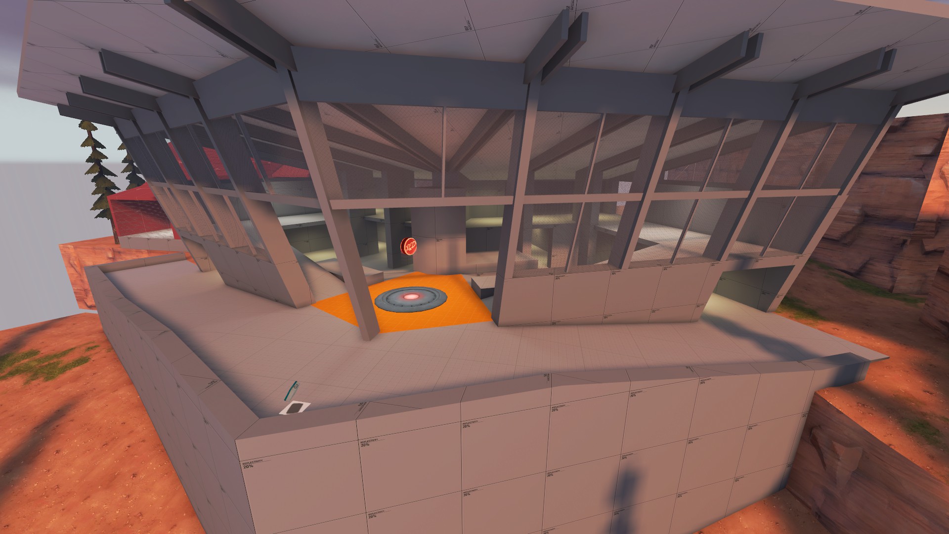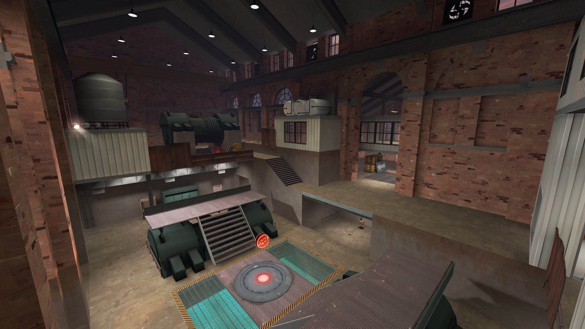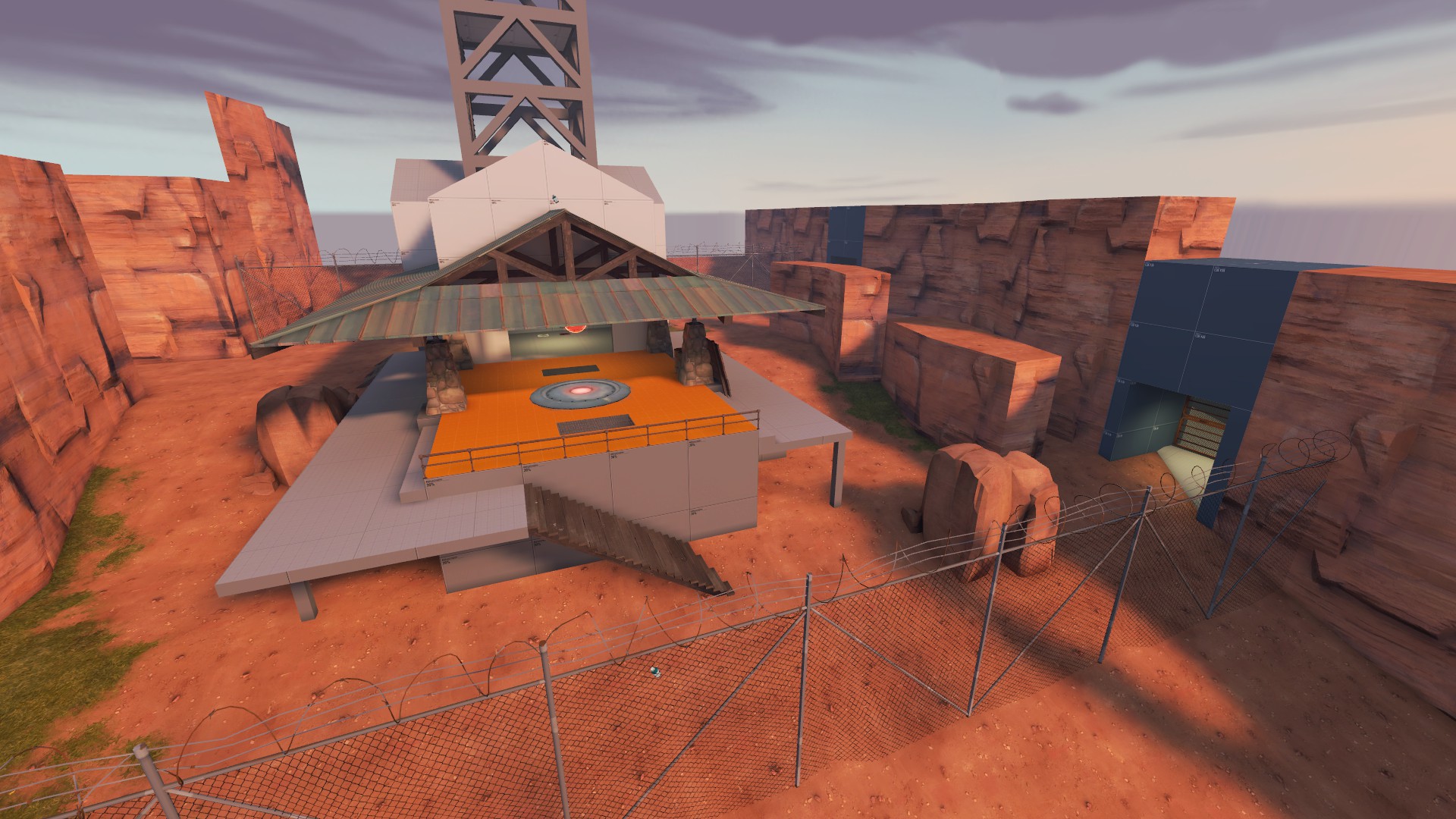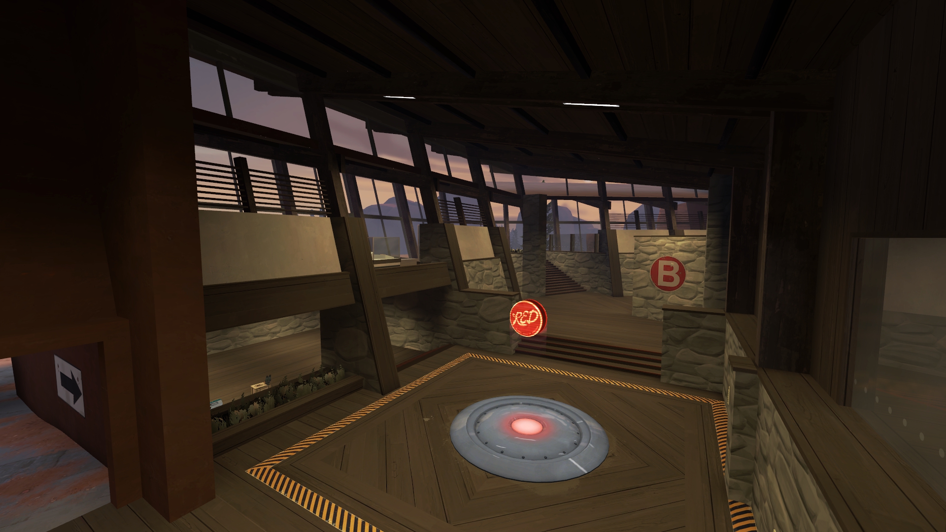 The layout is inspired by the chokepoint design from Valve's map 'Gorge'. The attacking team is given aggressive forward spawn placement after capturing each objective, allowing the connecting area into the next point to function as a sort of long chokepoint, where gameplay is a push and pull through a continuous but condensed area, rather than the chokepoint being a tight doorway connecting two open areas.