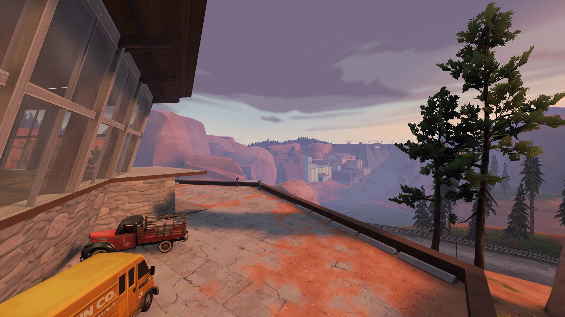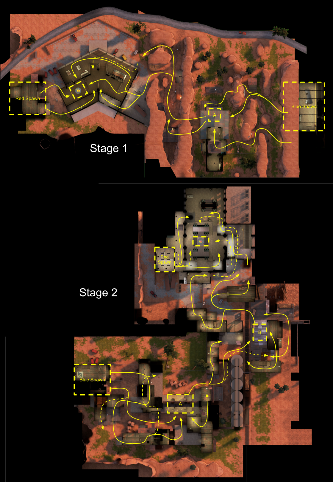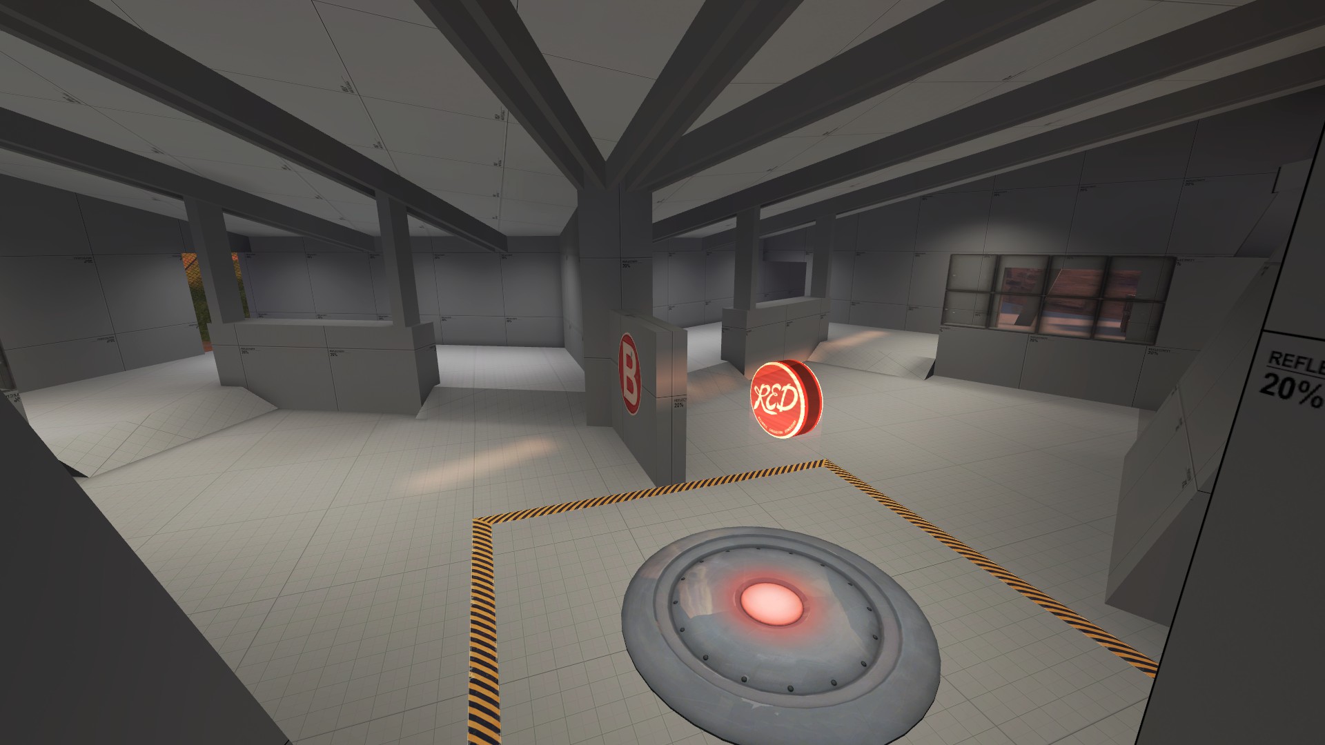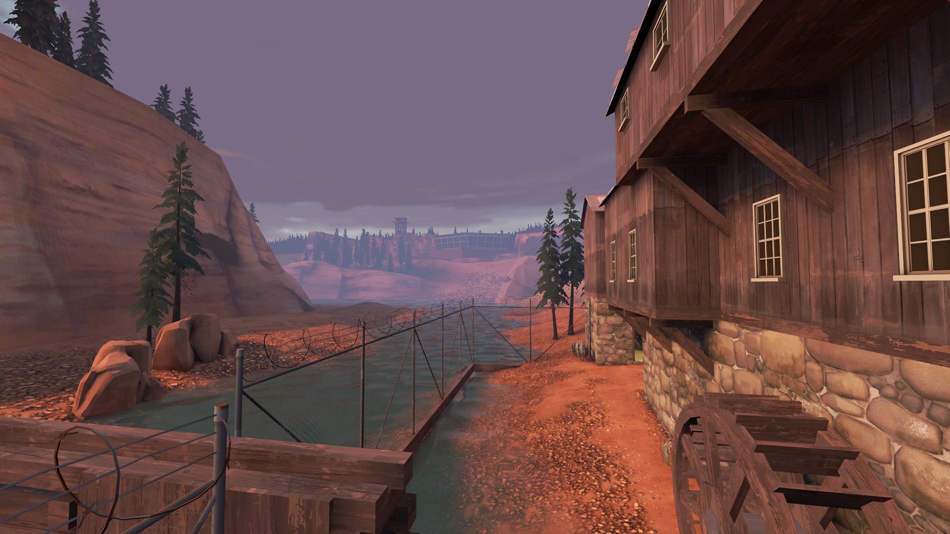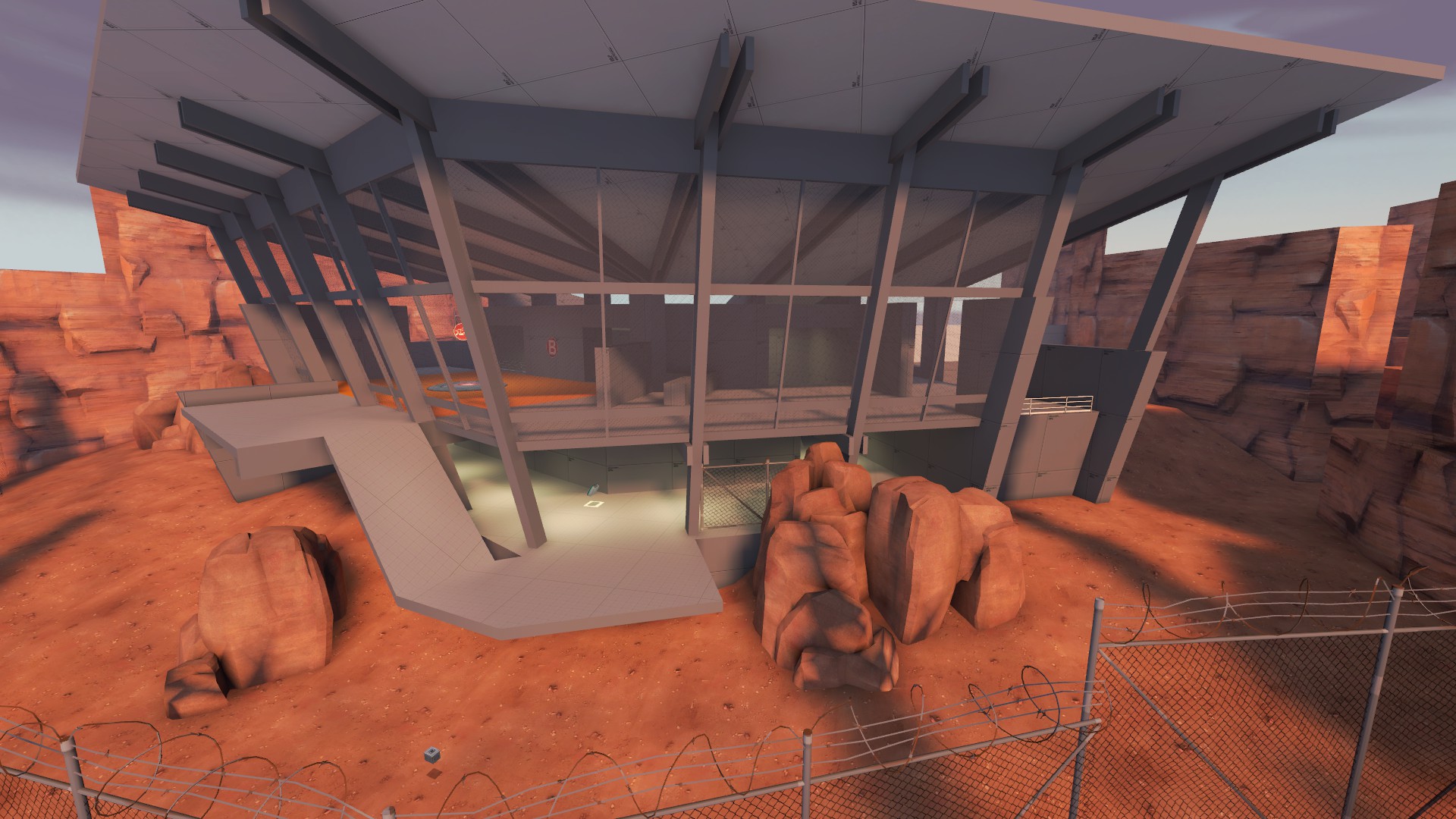 The layout is inspired by the chokepoint design from Valve's map 'Gorge'. The attacking team is given aggressive forward spawn placement after capturing each objective, allowing the connecting area into the next point to function as a sort of long chokepoint, where gameplay is a push and pull through a continuous but condensed area, rather than the chokepoint being a tight doorway connecting two open areas.
