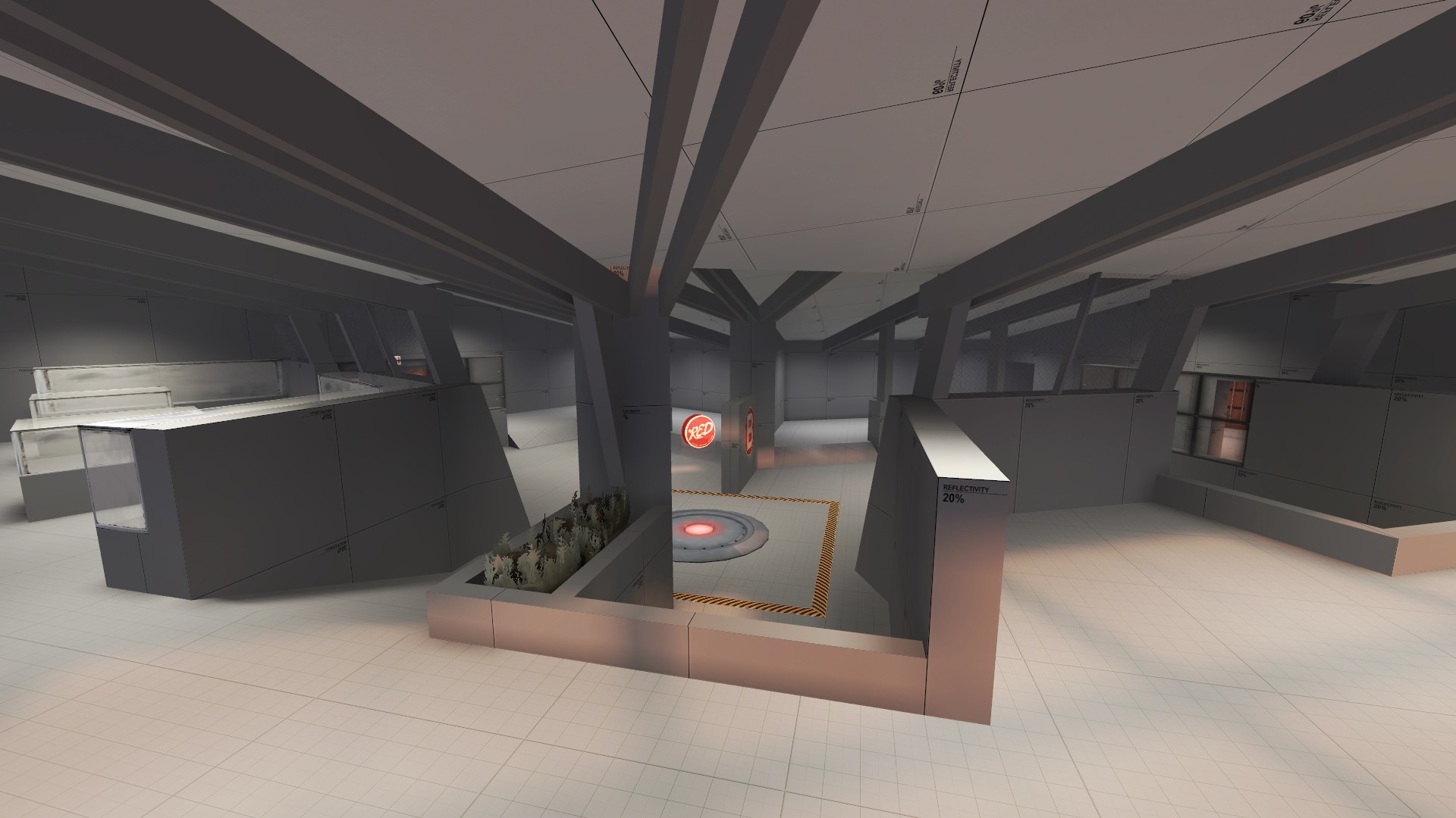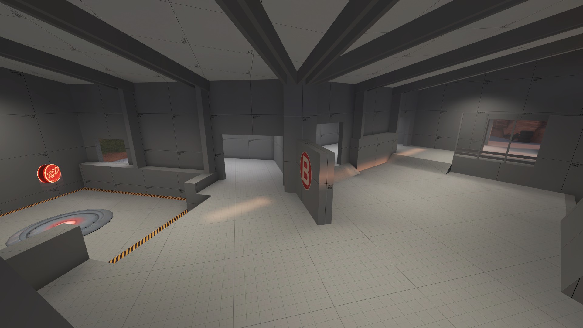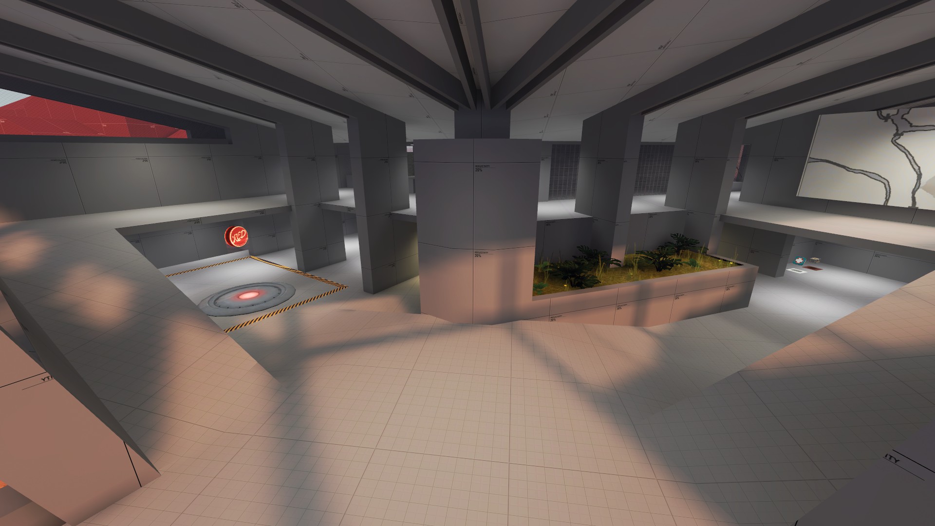 The second point originally had a large outdoor flank, but this proved inflexible and gave the defending team a significant height advantage over any attacking players using the flank. The flank is also very disconnected from the main route, making it a big commitment for attacking players. After a few iterations, this route was replaced with an indoors high ground that was more connected to the main area and provides an advantage for attackers that justifies the longer walk.